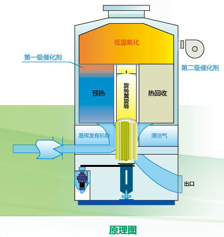 在生產(chǎn)過程中,排放的有機(jī)廢氣通過引風(fēng)機(jī)進(jìn)入設(shè)備的旋轉(zhuǎn)閥,通過旋轉(zhuǎn)閥講進(jìn)口氣體和出口氣體完全分開。氣體首先通過蓄熱體填充層(底層)預(yù)熱后發(fā)生熱量的交換,其溫度達(dá)到催化氧化所設(shè)定的溫度,這時其中部分污染物氧化分解;廢氣繼續(xù)通過加熱區(qū)升溫,并維持在設(shè)定溫度;再進(jìn)入催化層完成催化氧化反應(yīng),即徹底反應(yīng)生成C02和H2O,并釋放大量的熱量,達(dá)到廢氣凈化的效果。經(jīng)氧化后的氣體再進(jìn)入低溫的蓄熱體填充層,將熱能傳遞給蓄熱體后通過旋轉(zhuǎn)閥排放到大氣中,排氣溫度略高于廢氣處理前的溫度。系統(tǒng)聯(lián)系運轉(zhuǎn),自動切換。通過旋轉(zhuǎn)閥工作,所有的蓄熱體填充層均完成放熱,吸熱的循環(huán)步驟,熱量得以回收。