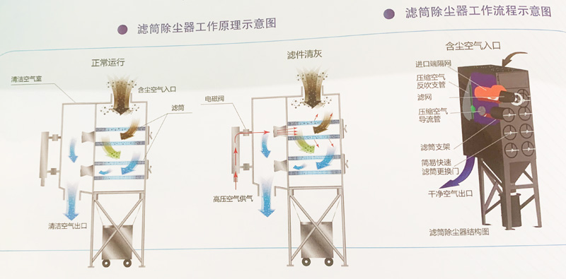 含塵氣體進入除塵器后,由于氣流斷面突然擴大,氣流中一部分顆粒粗大的塵粒在重力和慣性的作用下沉降下來。粒度細、密度小的塵粒進入過濾室,通過濾筒過濾等綜合效應,使粉塵沉積在濾筒表面,凈化后的氣體進入凈化室凈化達標排放。清潔濾筒利用壓縮空氣通過脈沖反吹,如同振動一樣將濾筒外表面聚集的粉塵震蕩及噴吹下來并落到下面的灰斗內。