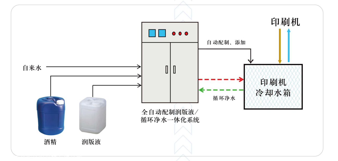 潤(rùn)版液凈水過(guò)濾系統(tǒng),潤(rùn)版液濃縮液、酒精(IPA)、自來(lái)水按一定的分量比例配置,混合后加到冷卻箱內(nèi),比起PH值管理或電導(dǎo)率管理的配置方式潤(rùn)版液濃度更精.準(zhǔn)、穩(wěn)定。可選擇加酒精和免酒精。