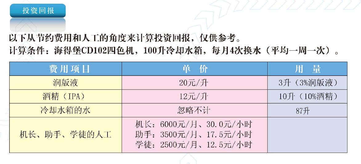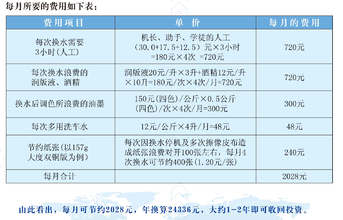 2.不需要經(jīng)常停機(jī)換水,清洗水箱,減少了水、潤(rùn)版液、IPA(異丙酮)的使用量,降低生產(chǎn)成本,清潔的水質(zhì)保持印刷機(jī)水管暢通,防止堵塞,減少維護(hù)時(shí)間和成本。
