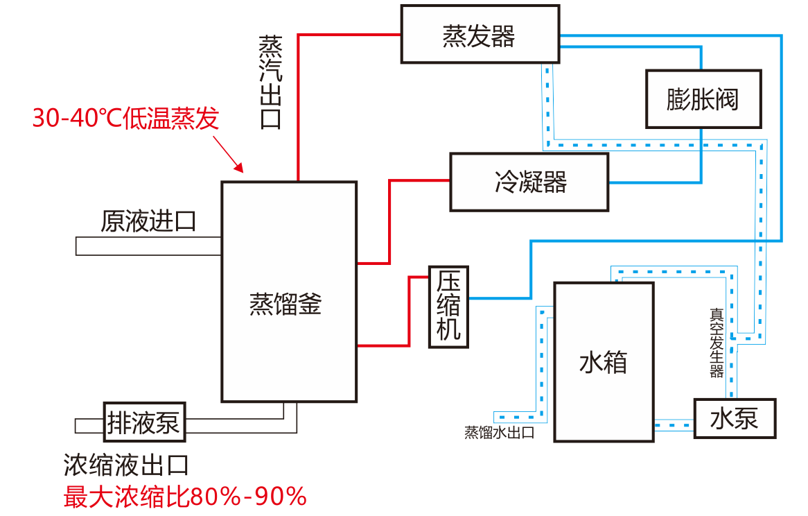 低溫真空蒸餾濃縮技術可避免某些敏感性物質(zhì)在高溫下產(chǎn)生的不良副反應,整個蒸發(fā)過程不會產(chǎn)生結(jié)晶、結(jié)垢現(xiàn)象,濃縮率達75%~95%,蒸餾出水可回用。