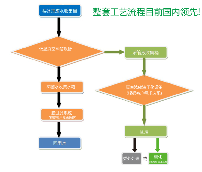 廢液中絕大部分污染物質(zhì)均存在于濃縮液(可濃縮至15~25%)中,濃縮液從蒸發(fā)器排放至濃液收集桶后經(jīng)真空濃縮干化設備(根據(jù)客戶實際情況選配)溫度 30~150℃(根據(jù)不同濃縮液含水份不同可調(diào))干化成固廢后,交有固廢處理資質(zhì)的環(huán)保公司處理或者做無害化處理(碳化設備根據(jù)客戶實際情況選配)